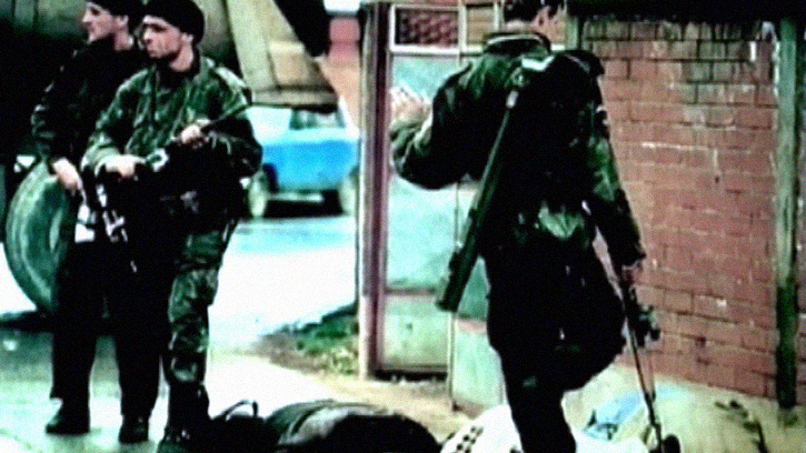 Conçu à partir d’une photographie de Ron Haviv prise à Bijeljina, le 31 mars 1992, dans les premiers jours de la guerre de Bosnie, où vient d’avoir lieu l’un des premiers épisodes d’épuration ethnique, Je vous salue, Sarajevo dénonce l’acte de guerre et la torture.