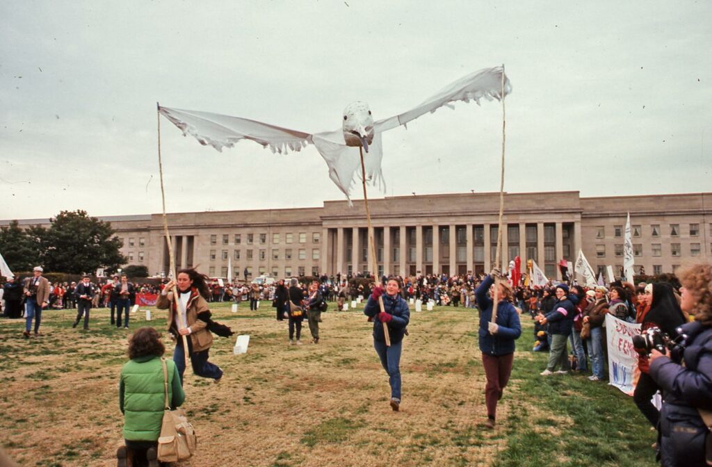 En 1980, après l’élection de Ronald Reagan, dans un climat de remobilisation militaire, deux mille femmes encerclent le Pentagone. Elles plantent des tombes et tissent une toile de fils de laine que les policiers coupent et qu’elles renouent, encore et encore. À la machine de guerre, elles opposent leur expérience du soin et de la vulnérabilité.